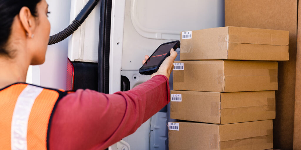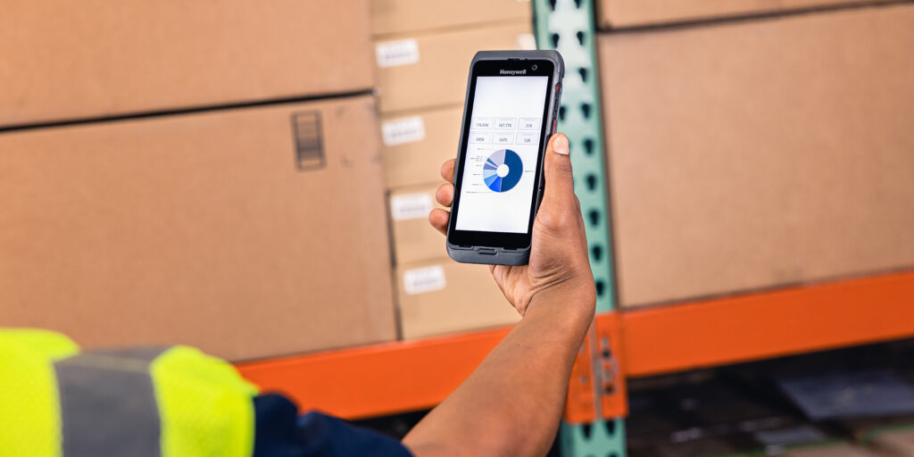 Computador móvel Honeywell CT47 em uso em ambiente logístico, destacando seu design robusto e tela de alta definição.
